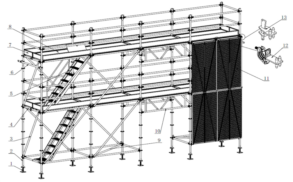 1---可調(diào)底座; 2---立桿; 3---豎向斜桿; 4---水平桿(橫桿); 5---上落梯; 6---連墻件; 7---踢腳板; 8---工作平臺(踏板); 9---水平斜桿; 10---水平桁架; 11---防護(hù)網(wǎng); 12---防護(hù)網(wǎng)水平桿連接件; 13---防護(hù)網(wǎng)立桿連接件。 |