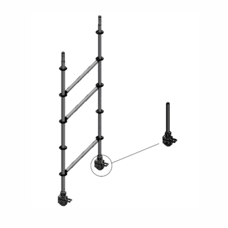 1. 腳手架塔須由至少2名工作人員操作。有關(guān)適當(dāng)培訓(xùn)的詳細(xì)信息,請與您的供應(yīng)商聯(lián)系。應(yīng)用制動器,并將可調(diào)整的腳輪安裝到立柱管內(nèi)。 | 2. 將2個水平橫桿安裝在立柱的連接盤內(nèi)。參見放大視圖。 |