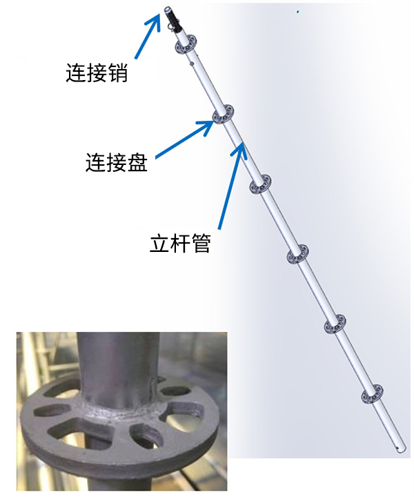 ② 管體每隔500MM設(shè)置焊接8孔連接盤;各桿件軸心交于一點。架體受力以軸心受壓為主,由于有斜拉桿的連接,使得架體的每個單元近似于格構(gòu)柱,因而承載力高,不易發(fā)生失穩(wěn)。 ③ 連接銷固定于立桿一端,用于立桿豎向接長的內(nèi)插管。 |
