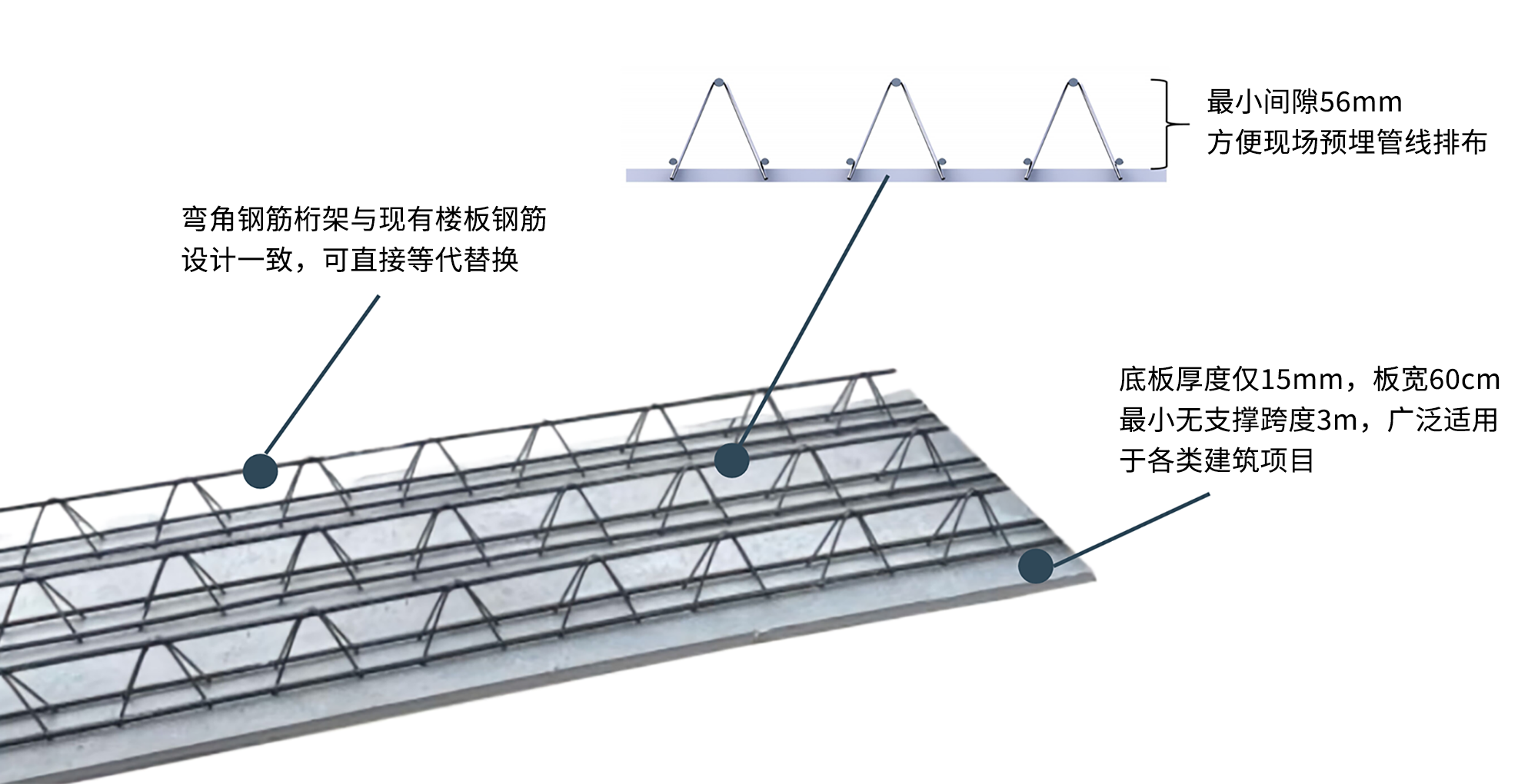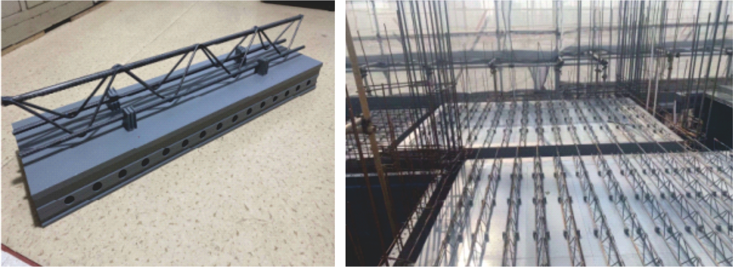 底板上部析架最小間隙55mm,增加了現(xiàn)場預(yù)埋管線的允許直徑,方便現(xiàn)場管線預(yù)埋并降低了預(yù)埋成本 |
