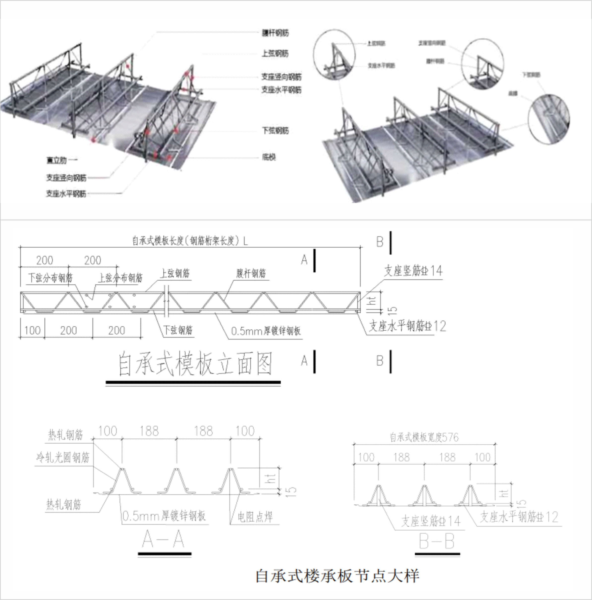 1、上下弦鋼筋:采用三級熱軋盤螺鋼筋HRB400、HRB300; 2、腹桿鋼筋:采用三級熱軋盤螺鋼筋HRB400或性能等同CRB550的冷軋光園鋼筋; 3、支座橫筋: 豎筋采用三級熱軋盤螺HRB400、HRB300; 4、底模鋼板:采用Q235冷軋鋼板或不低于S250GD+2牌號鍍鋅鋼板、鍍鋅量雙面不小于120g/m |